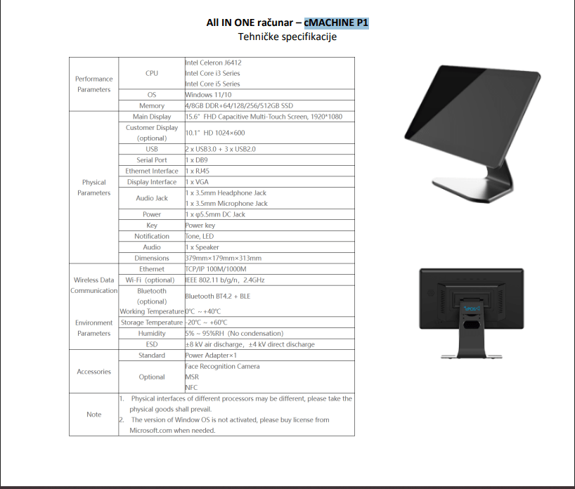 IMACHINE P1 DESKTOP POS TERMINAL, Intel Celeron J6412, 2.00 GHz, 4Core, 1.5 MB Cache, 8GB DDR4 2400MHz, SSD 128GB M.2., 15,6” FHD Capacitive Multi-Touch Screen, 1920×1080